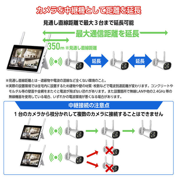 完全ワイヤレス接続!モニターとカメラ間の配線工事が不要で設置が簡単です。