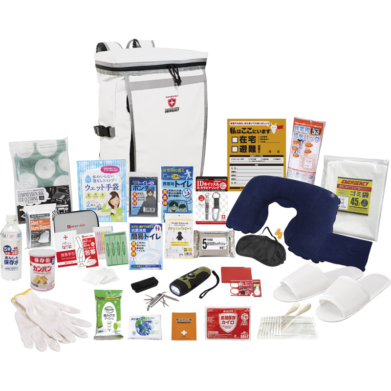 ●内容:収納リュック(ホワイトカラー)サイズ:300×180×470mm、防災の心得、IDホイッスル&カラビナリング、カイロ、レインコート、携帯用トイレ、抗菌消臭簡易トイレ、トイレポンチョ、ダイナモマルチライト、モバイルバッテリー(乾電池式・電池別売)、軍手、静音アルミブランケット、歯磨きティッシュ1日分・ウェットティッシュ、衣類圧縮袋、スリッパ、ネックピロー、アイマスク、耳栓、5年保存水500mL、カンパン(5年保存、小麦・乳)、カトラリーセット、8徳ナイフ、給水袋3L、ソーイングセット、緊急避難カード、水に流せるペーパー、救急